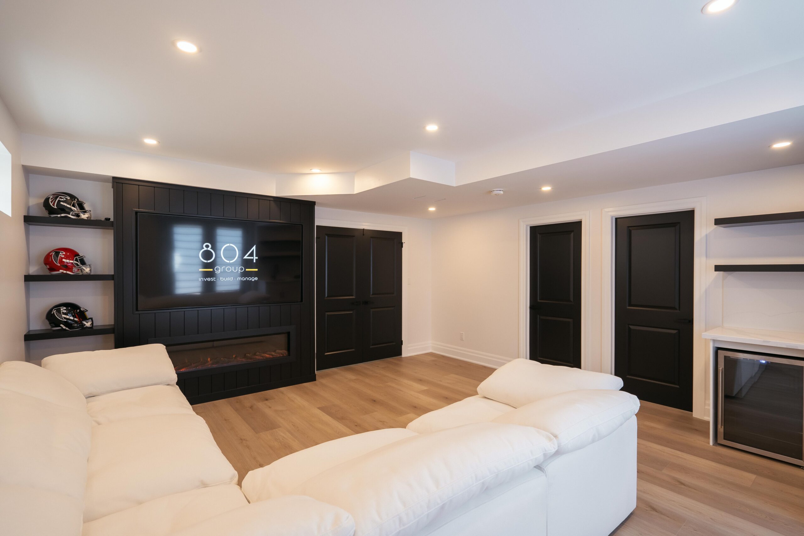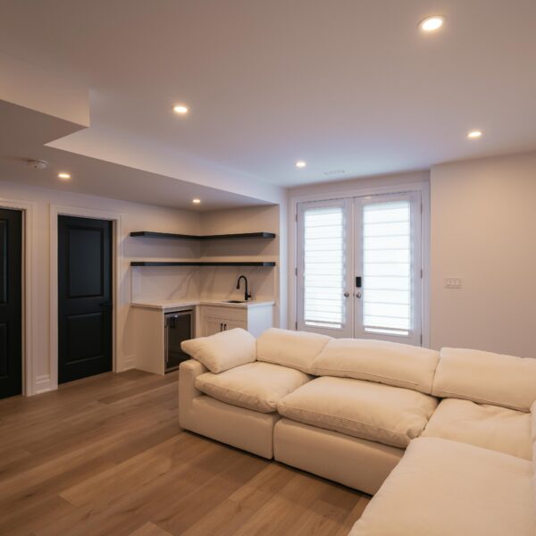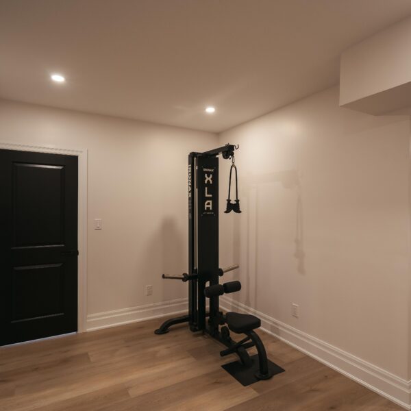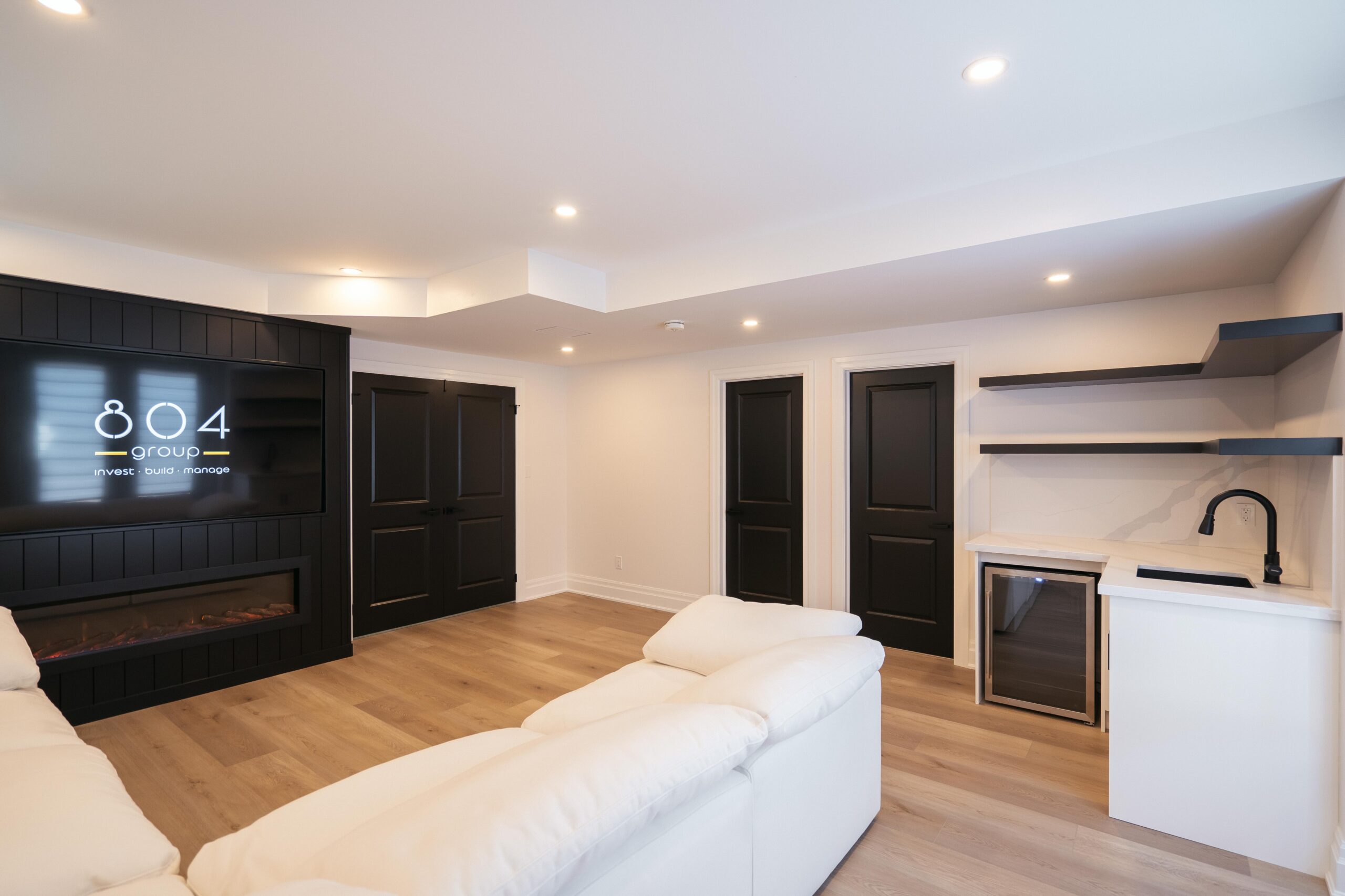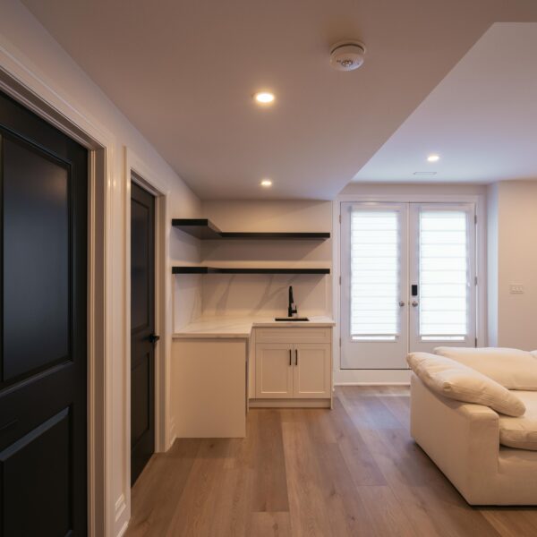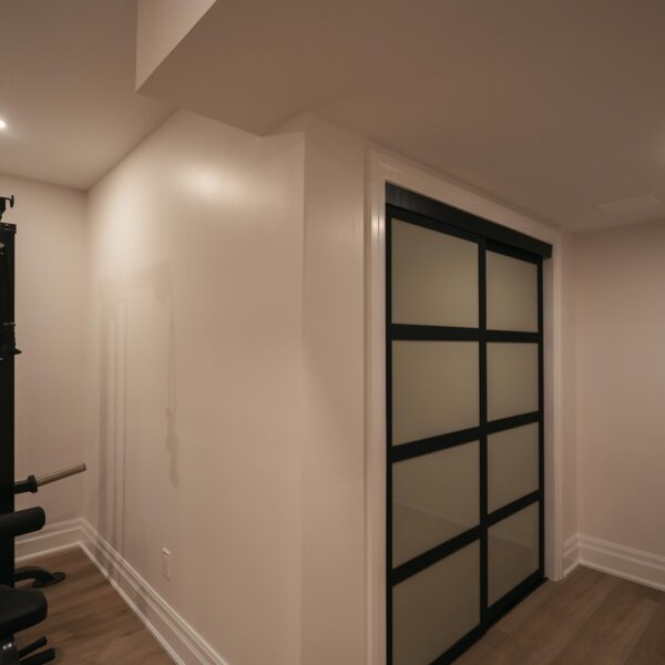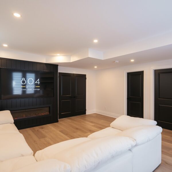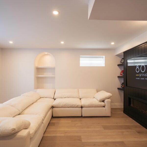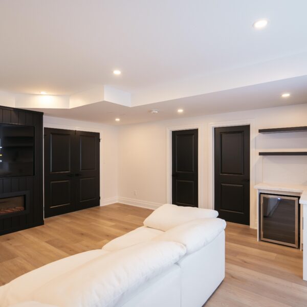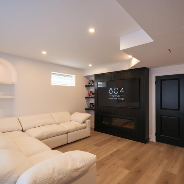Take a look through our finish basement project in Stoney Creek. This was originally an unfinished basement space just waiting for its finishing touches. We were able to take out clients vision and turn it into a reality. With a classic black and white pallet, we maintained an elegant finish throughout. The basement was separated into different rooms from a bedroom, gym space, bathroom and living space complete with a kitchenette. Different features included a custom fireplace with shiplap and built in shelves, an arch built in unit with floating shelves and integrated storage bin below and black accents throughout. No stone was left unturned in this space as we even built a custom three piece bathroom with custom vanity and walk in shower. We definitely know where to watch the game on Sundays!