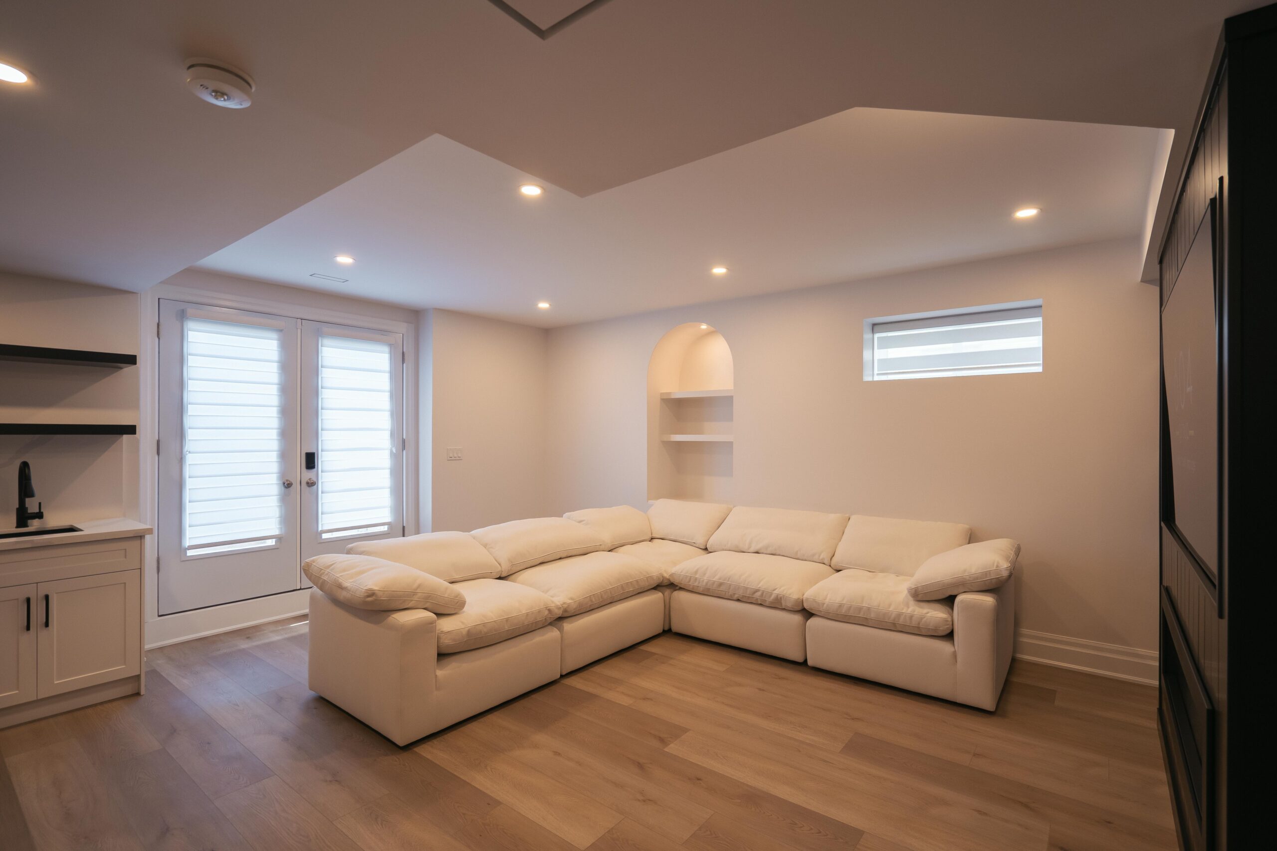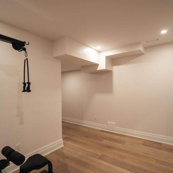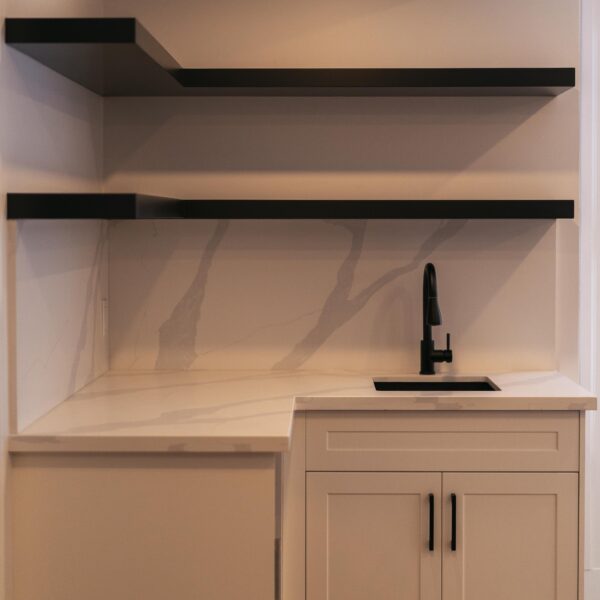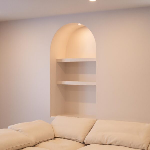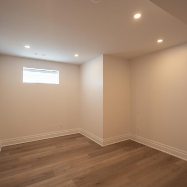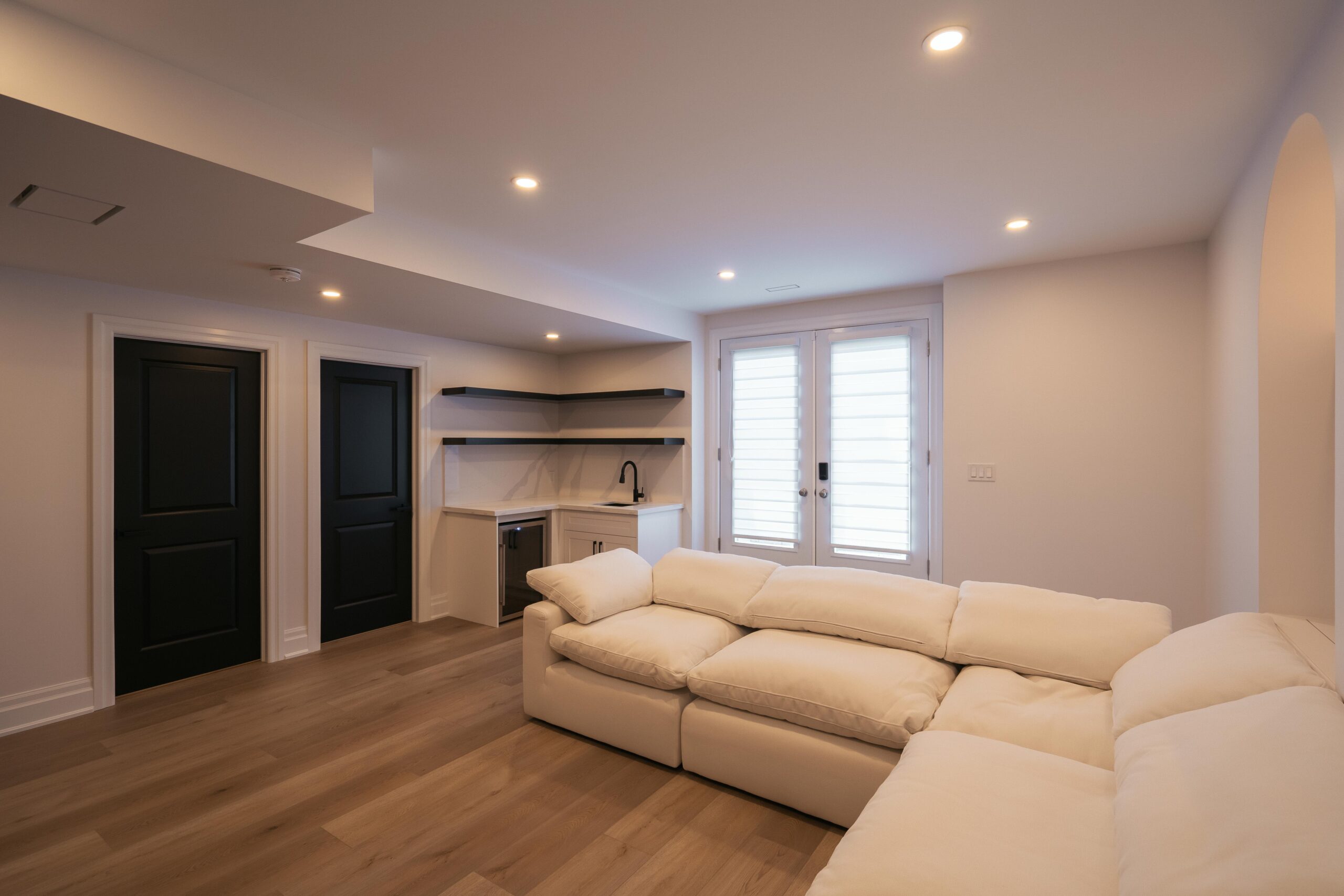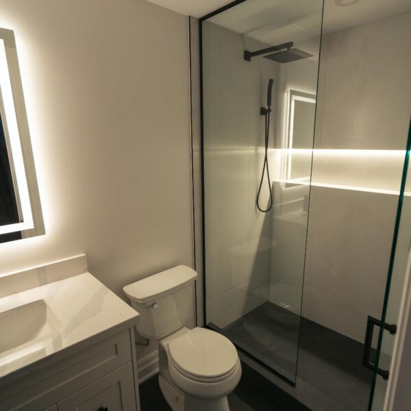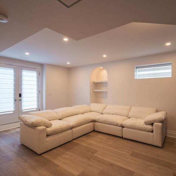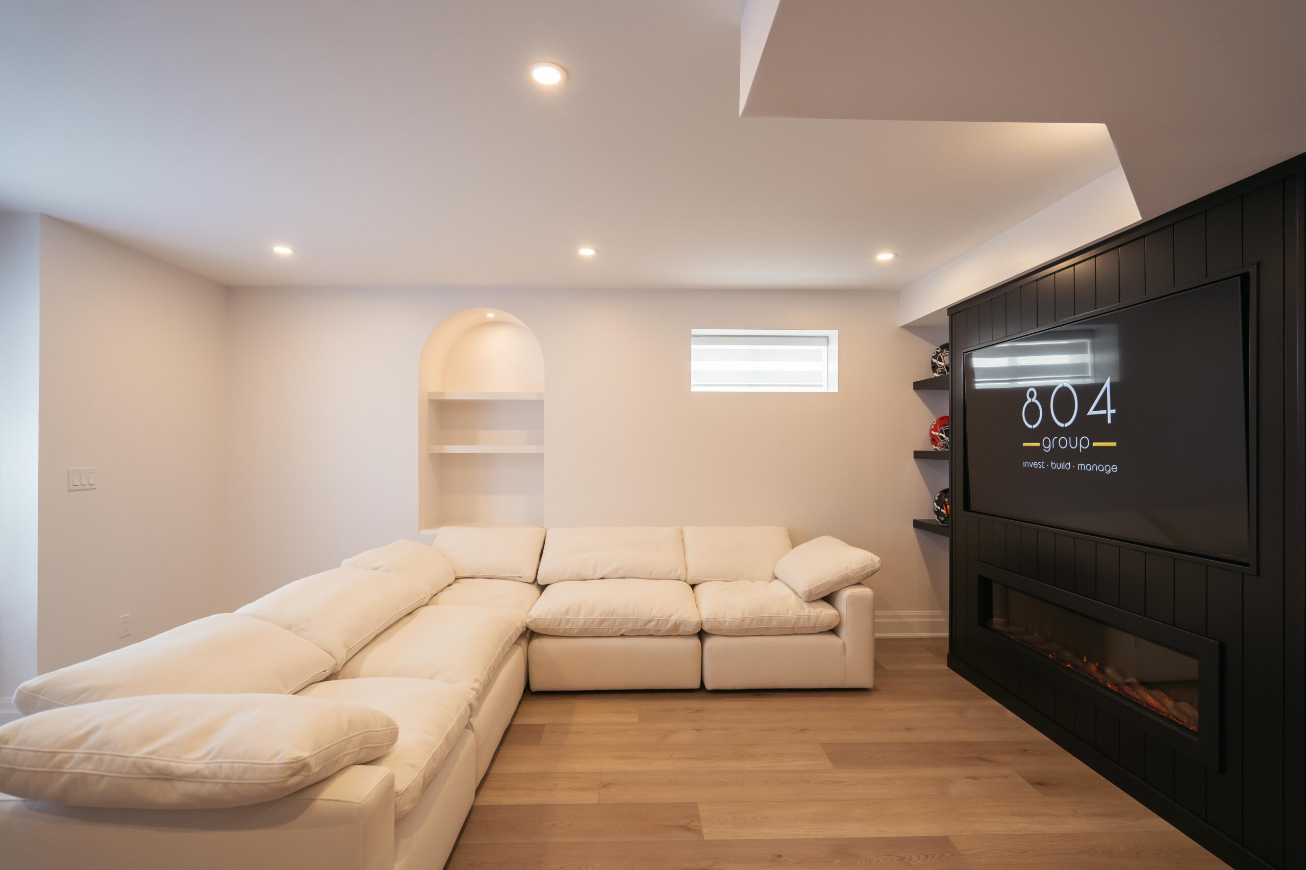 Take a look through our finish basement project in Stoney Creek. This was originally an unfinished basement space just waiting for its finishing touches. We were able to take out clients vision and turn it into a reality. With a classic black and white pallet, we maintained an elegant finish throughout. The basement was separated into different rooms from a bedroom, gym space, bathroom and living space complete with a kitchenette. Different features included a custom fireplace with shiplap and built in shelves, an arch built in unit with floating shelves and integrated storage bin below and black accents throughout. No stone was left unturned in this space as we even built a custom three piece bathroom with custom vanity and walk in shower. We definitely know where to watch the game on Sundays!