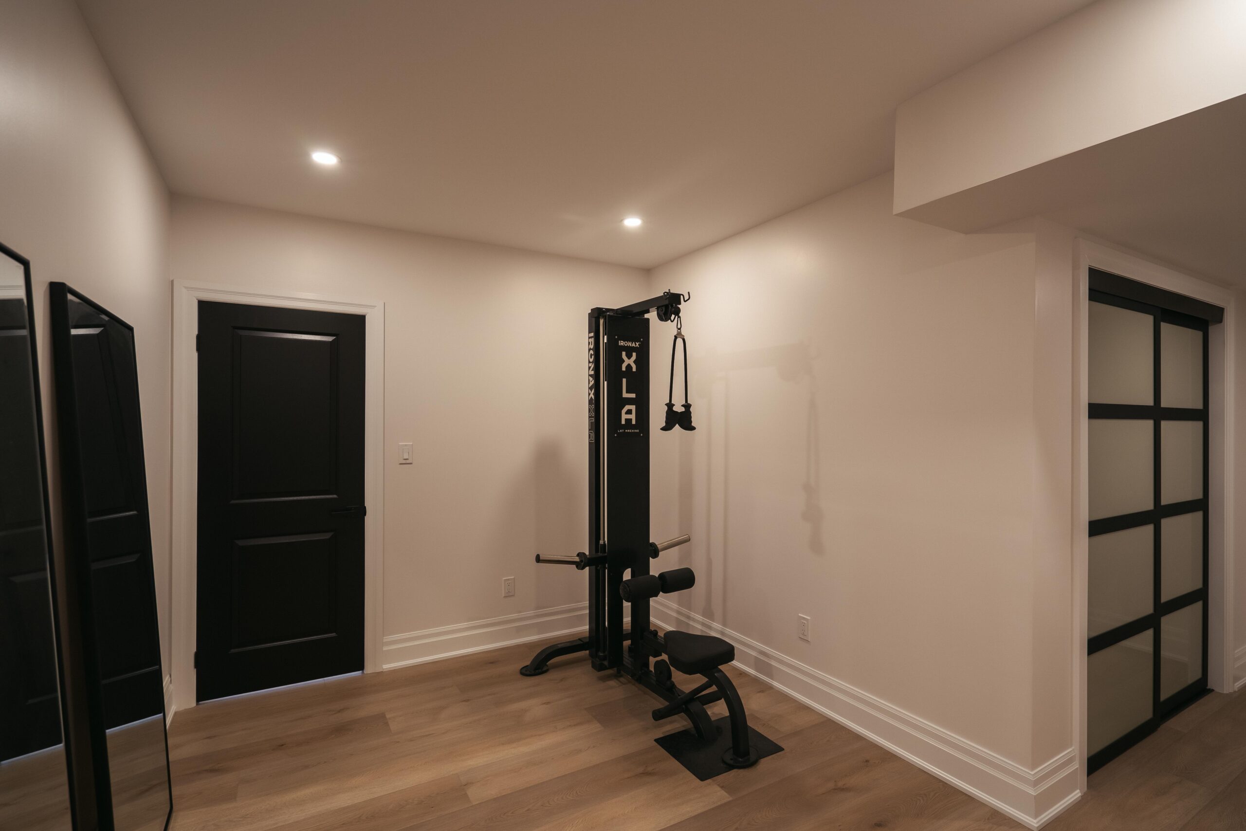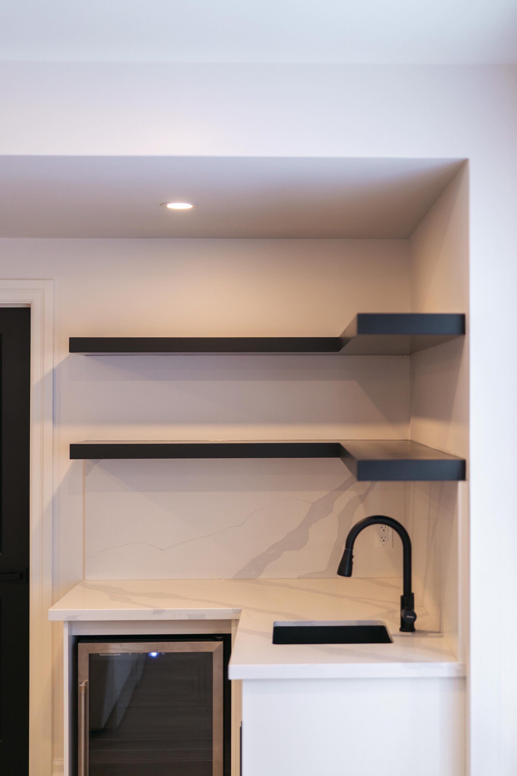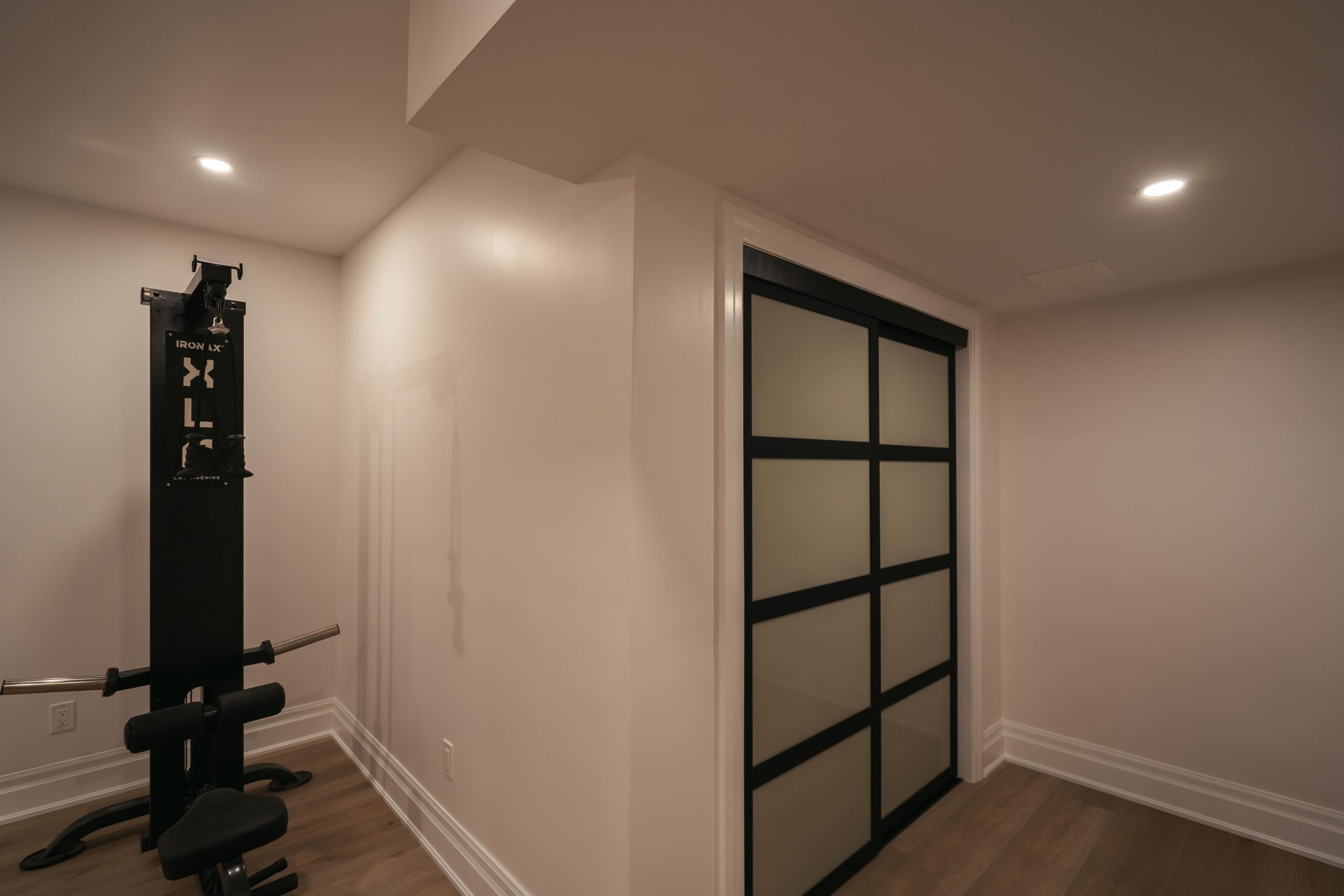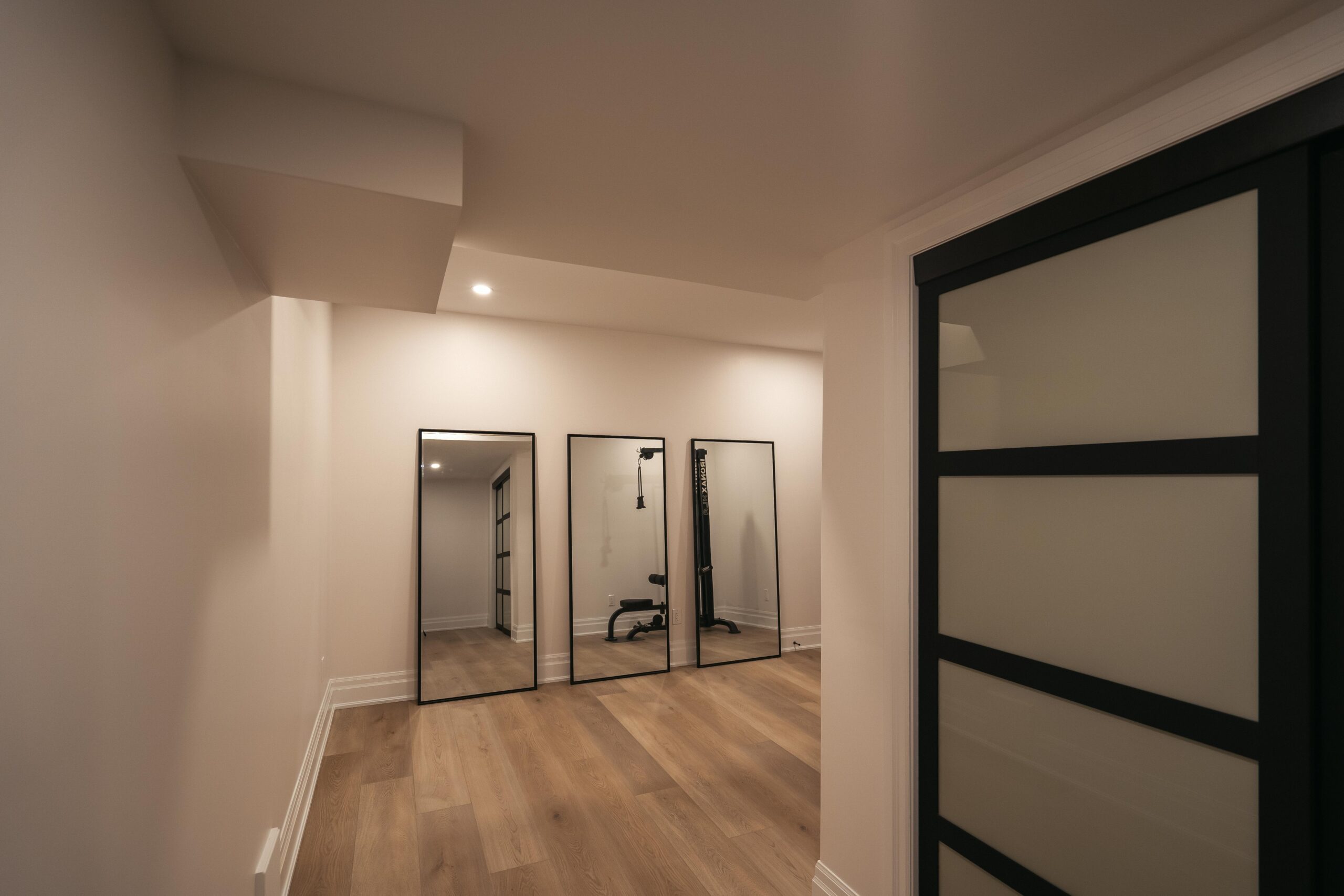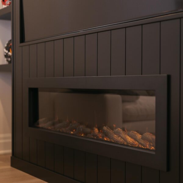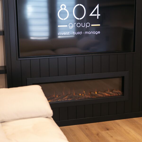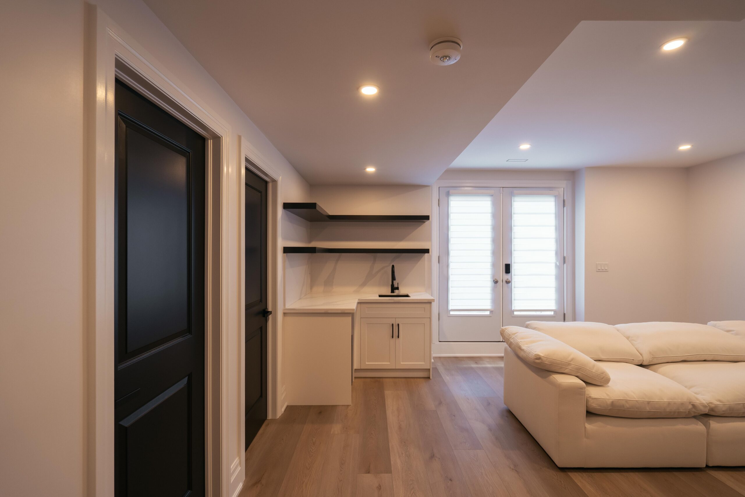 Take a look through our finish basement project in Stoney Creek. This was originally an unfinished basement space just waiting for its finishing touches. We were able to take out clients vision and turn it into a reality. With a classic black and white pallet, we maintained an elegant finish throughout. The basement was separated into different rooms from a bedroom, gym space, bathroom and living space complete with a kitchenette. Different features included a custom fireplace with shiplap and built in shelves, an arch built in unit with floating shelves and integrated storage bin below and black accents throughout. No stone was left unturned in this space as we even built a custom three piece bathroom with custom vanity and walk in shower. We definitely know where to watch the game on Sundays!