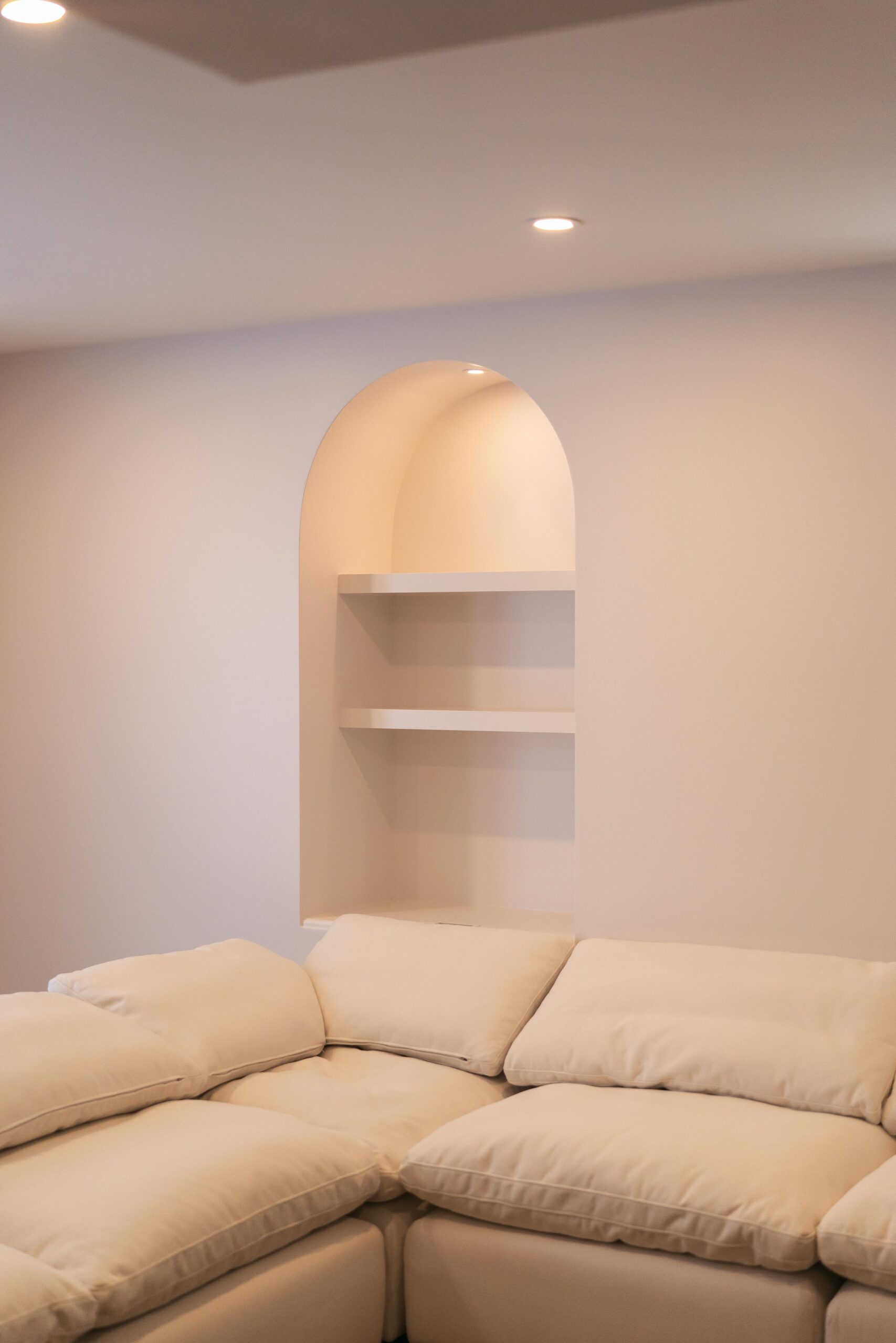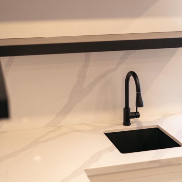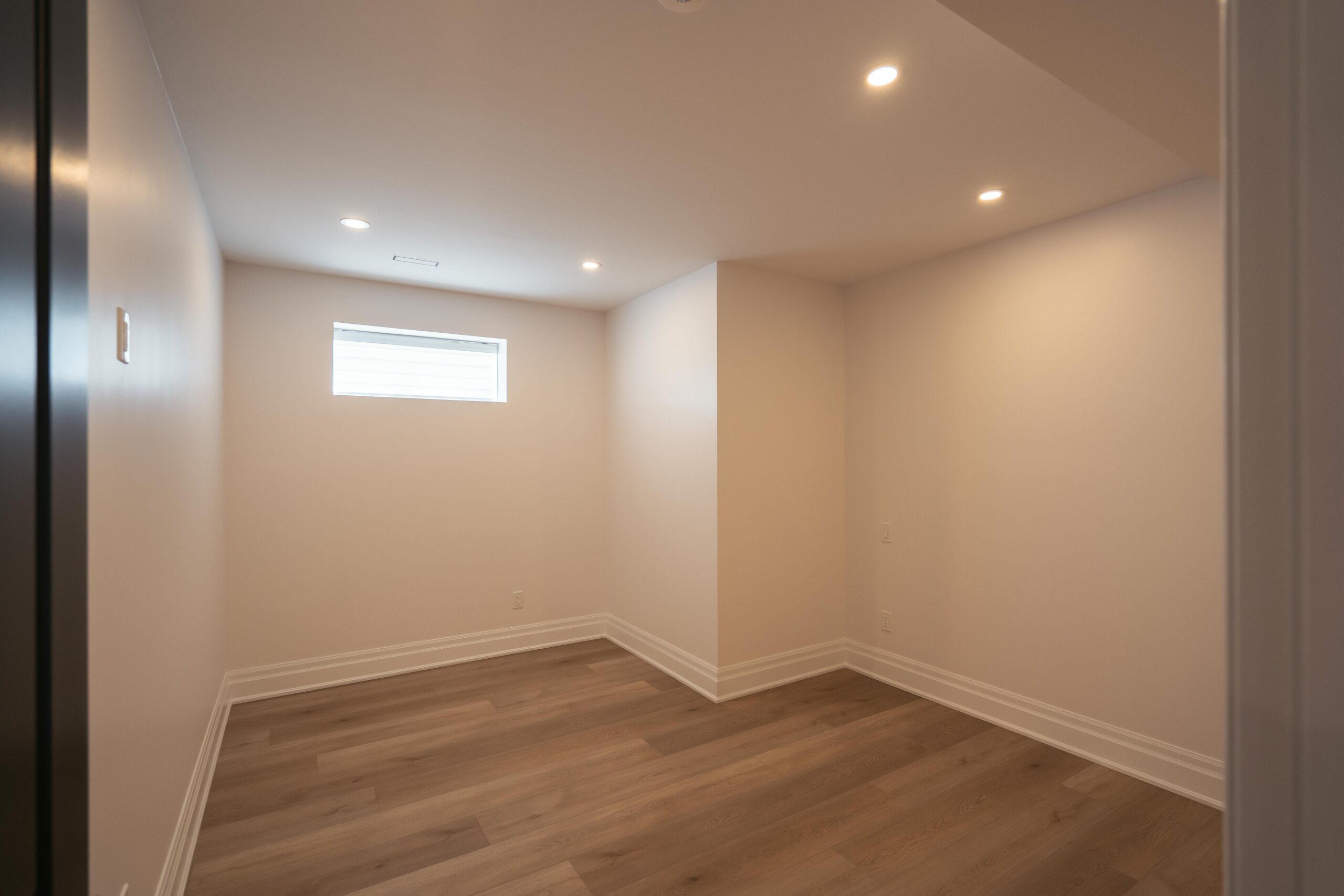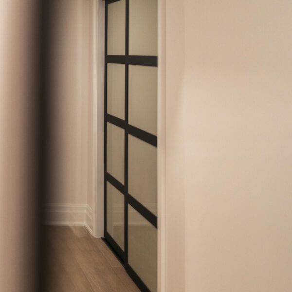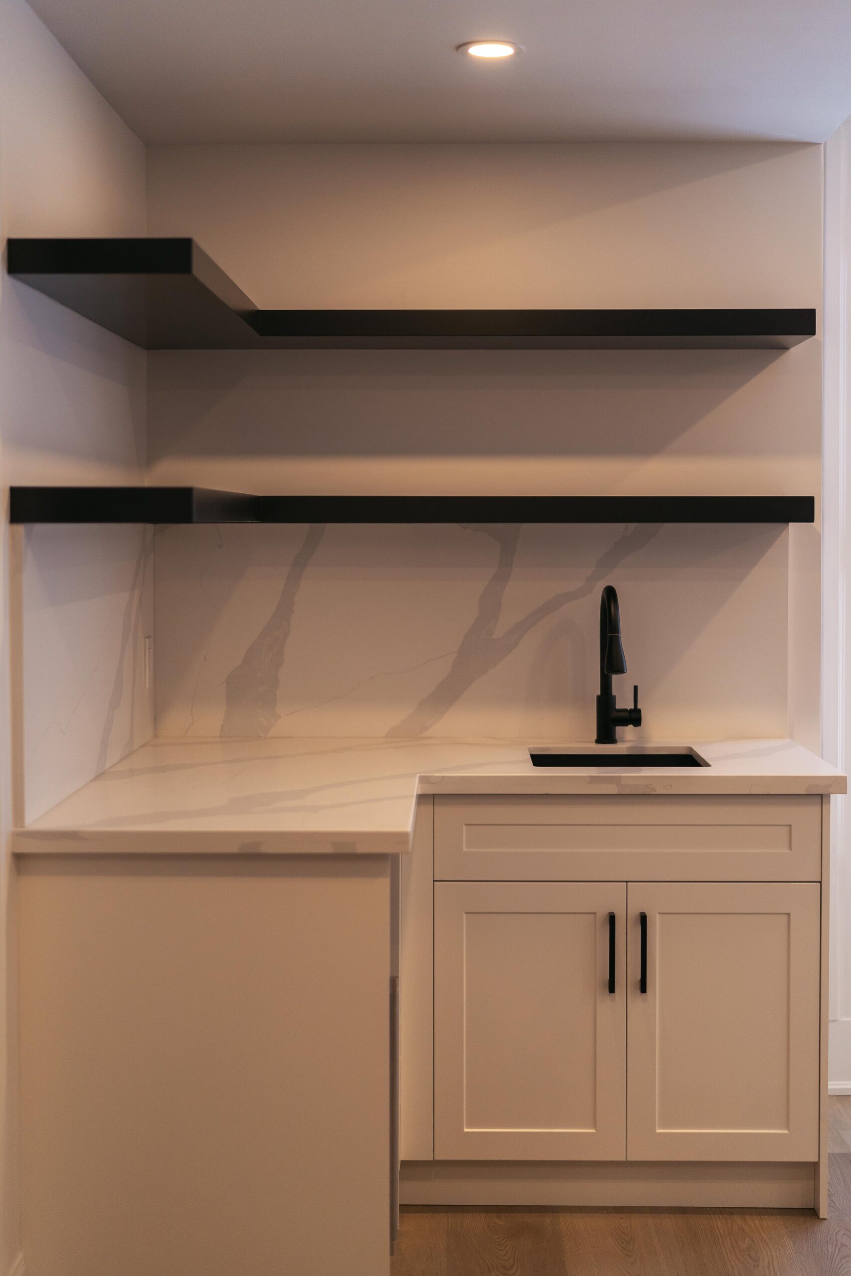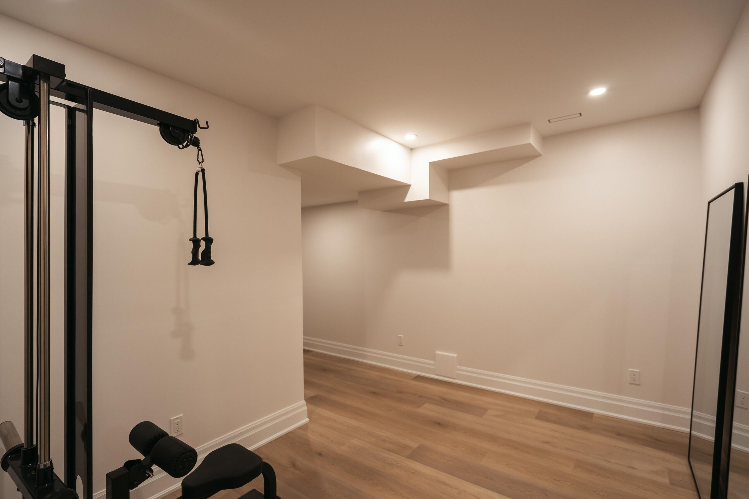 Take a look through our finish basement project in Stoney Creek. This was originally an unfinished basement space just waiting for its finishing touches. We were able to take out clients vision and turn it into a reality. With a classic black and white pallet, we maintained an elegant finish throughout. The basement was separated into different rooms from a bedroom, gym space, bathroom and living space complete with a kitchenette. Different features included a custom fireplace with shiplap and built in shelves, an arch built in unit with floating shelves and integrated storage bin below and black accents throughout. No stone was left unturned in this space as we even built a custom three piece bathroom with custom vanity and walk in shower. We definitely know where to watch the game on Sundays!