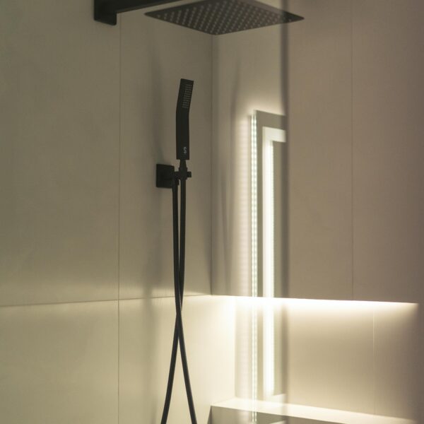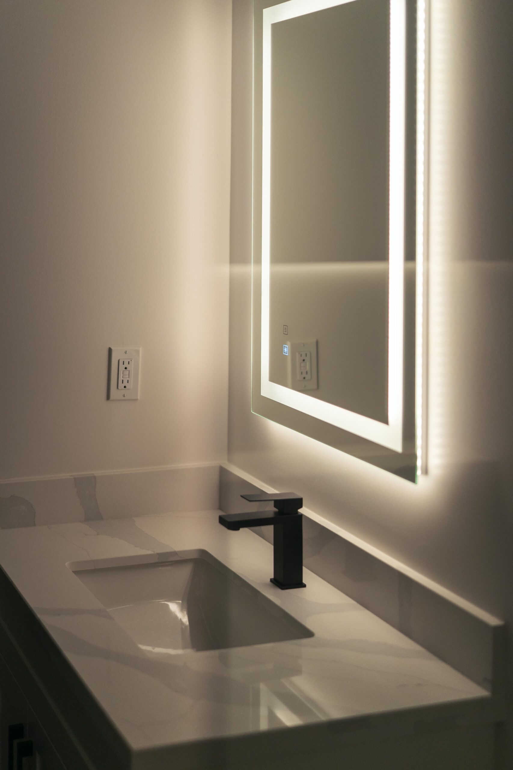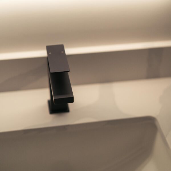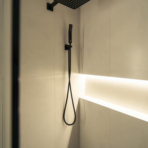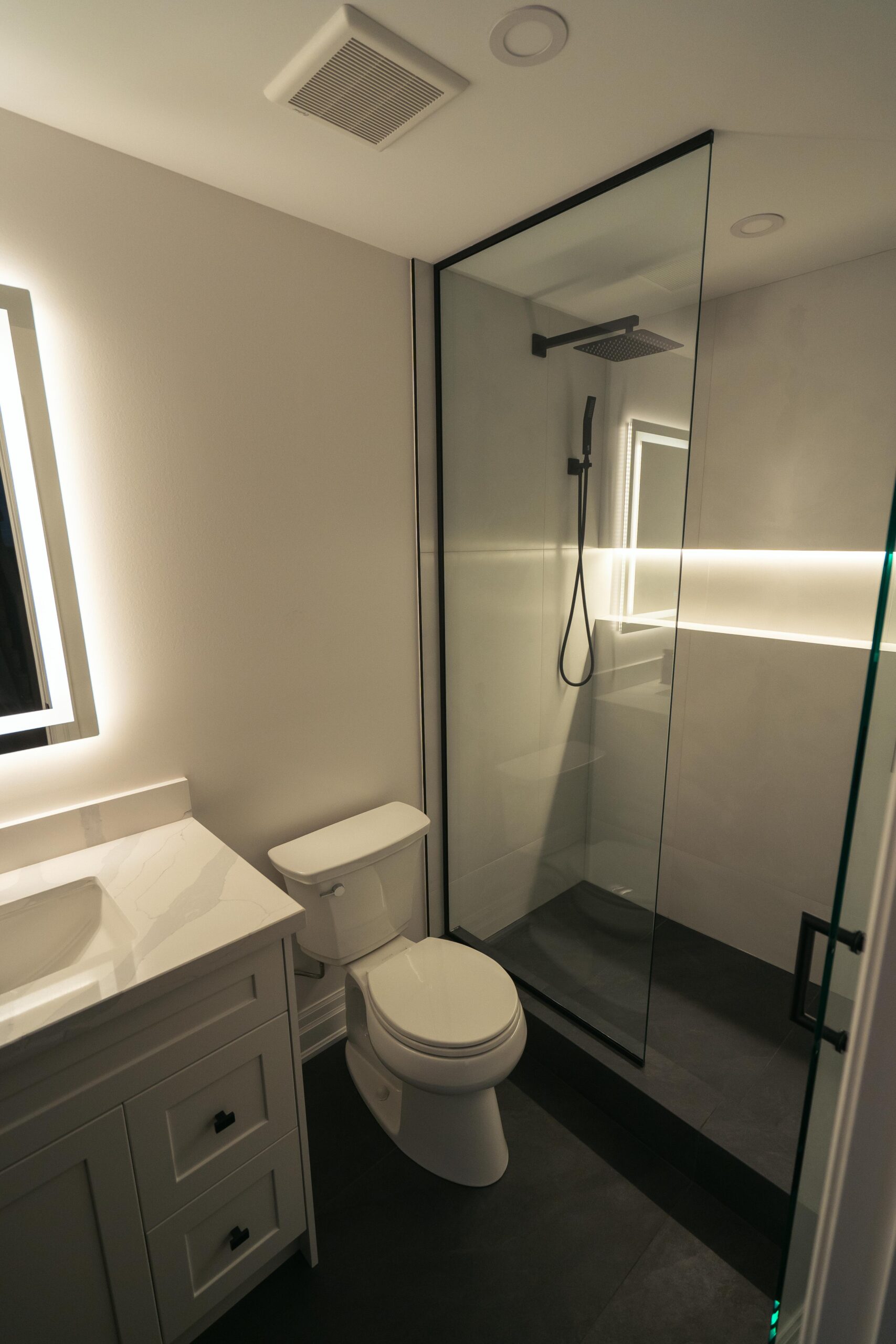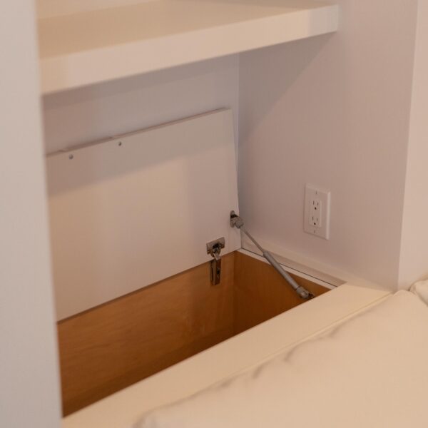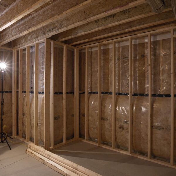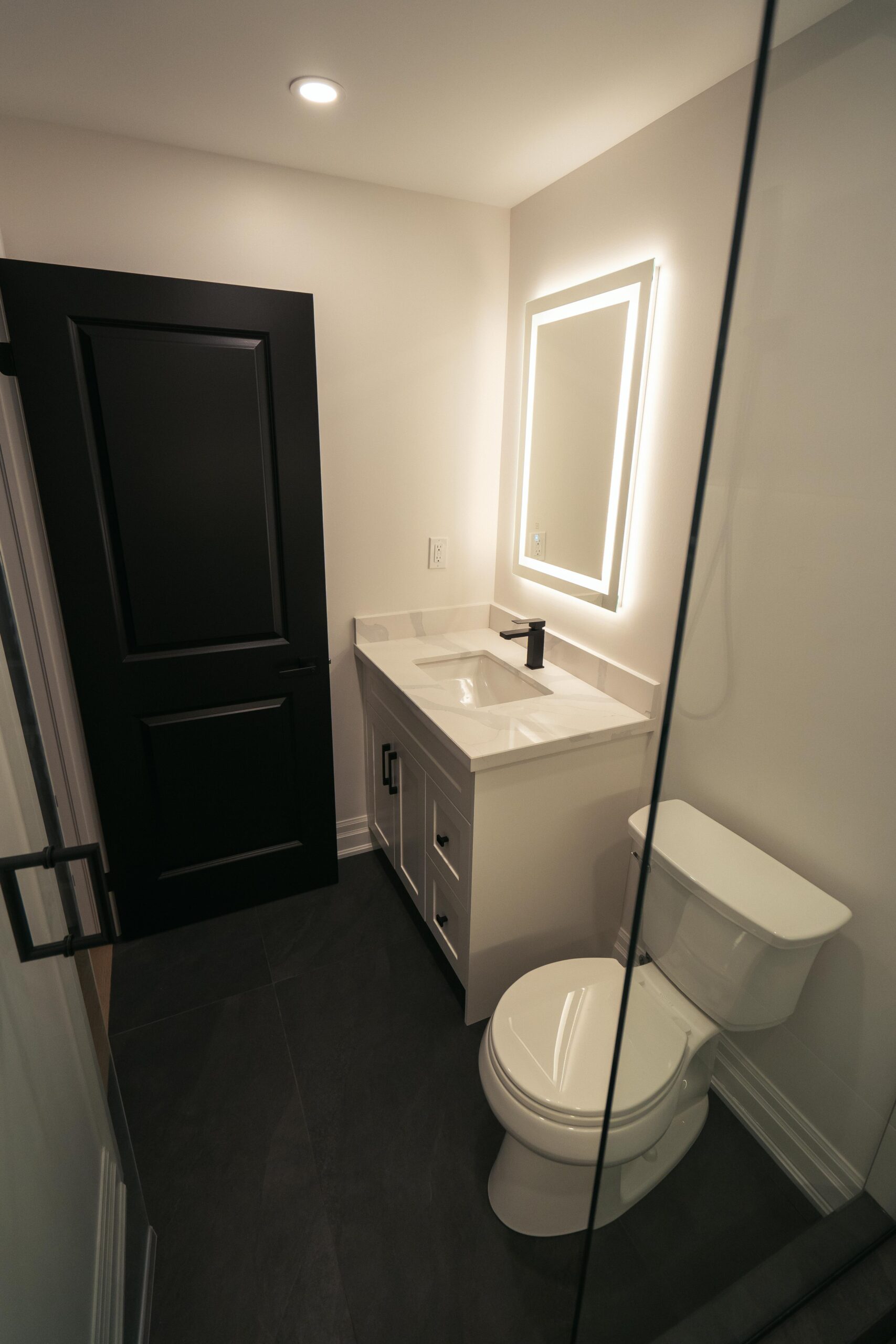 Take a look through our finish basement project in Stoney Creek. This was originally an unfinished basement space just waiting for its finishing touches. We were able to take out clients vision and turn it into a reality. With a classic black and white pallet, we maintained an elegant finish throughout. The basement was separated into different rooms from a bedroom, gym space, bathroom and living space complete with a kitchenette. Different features included a custom fireplace with shiplap and built in shelves, an arch built in unit with floating shelves and integrated storage bin below and black accents throughout. No stone was left unturned in this space as we even built a custom three piece bathroom with custom vanity and walk in shower. We definitely know where to watch the game on Sundays!