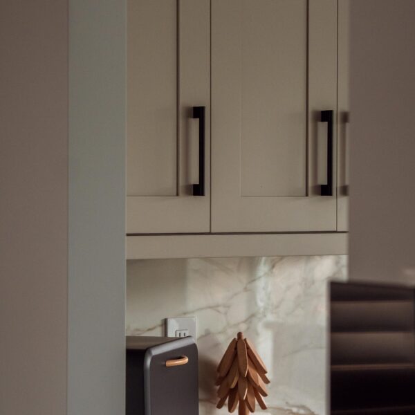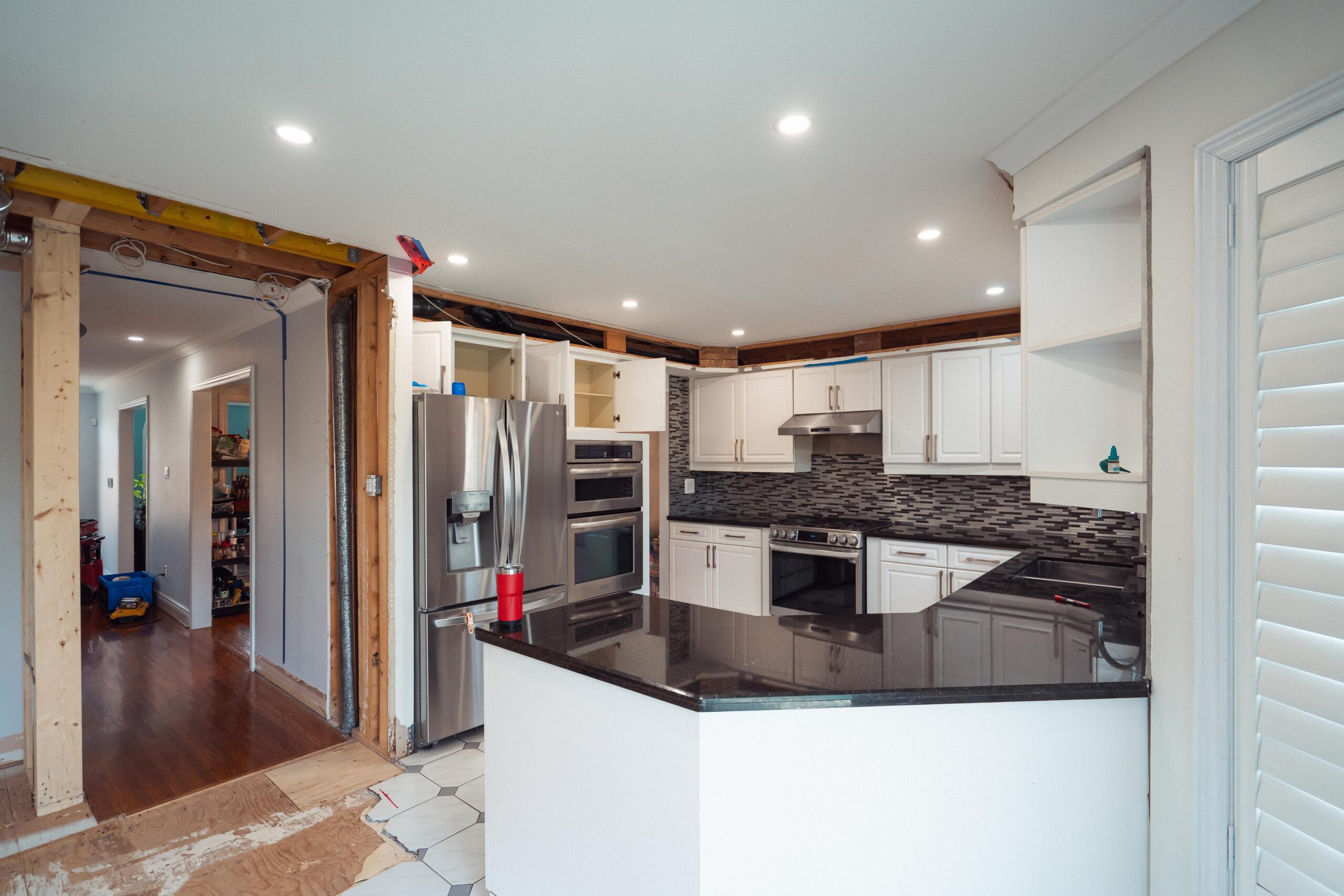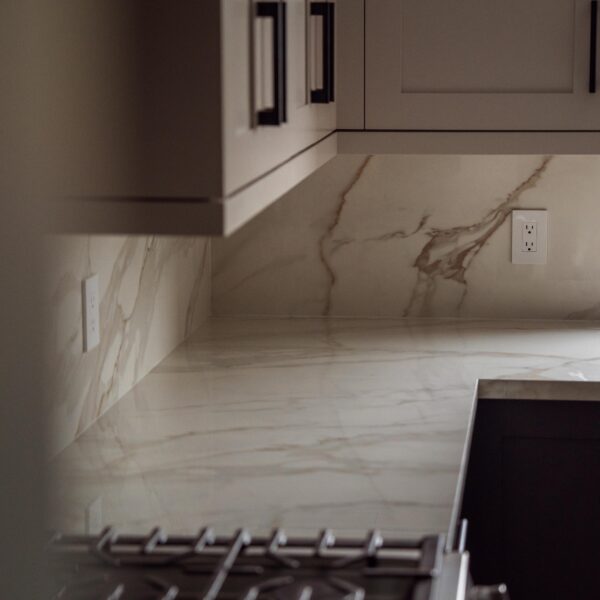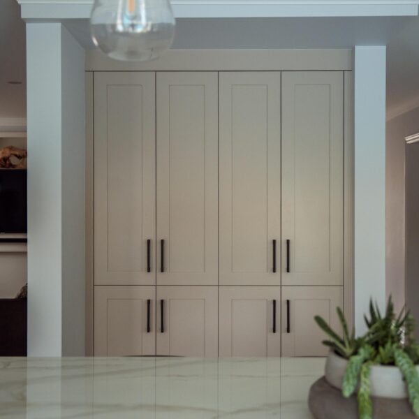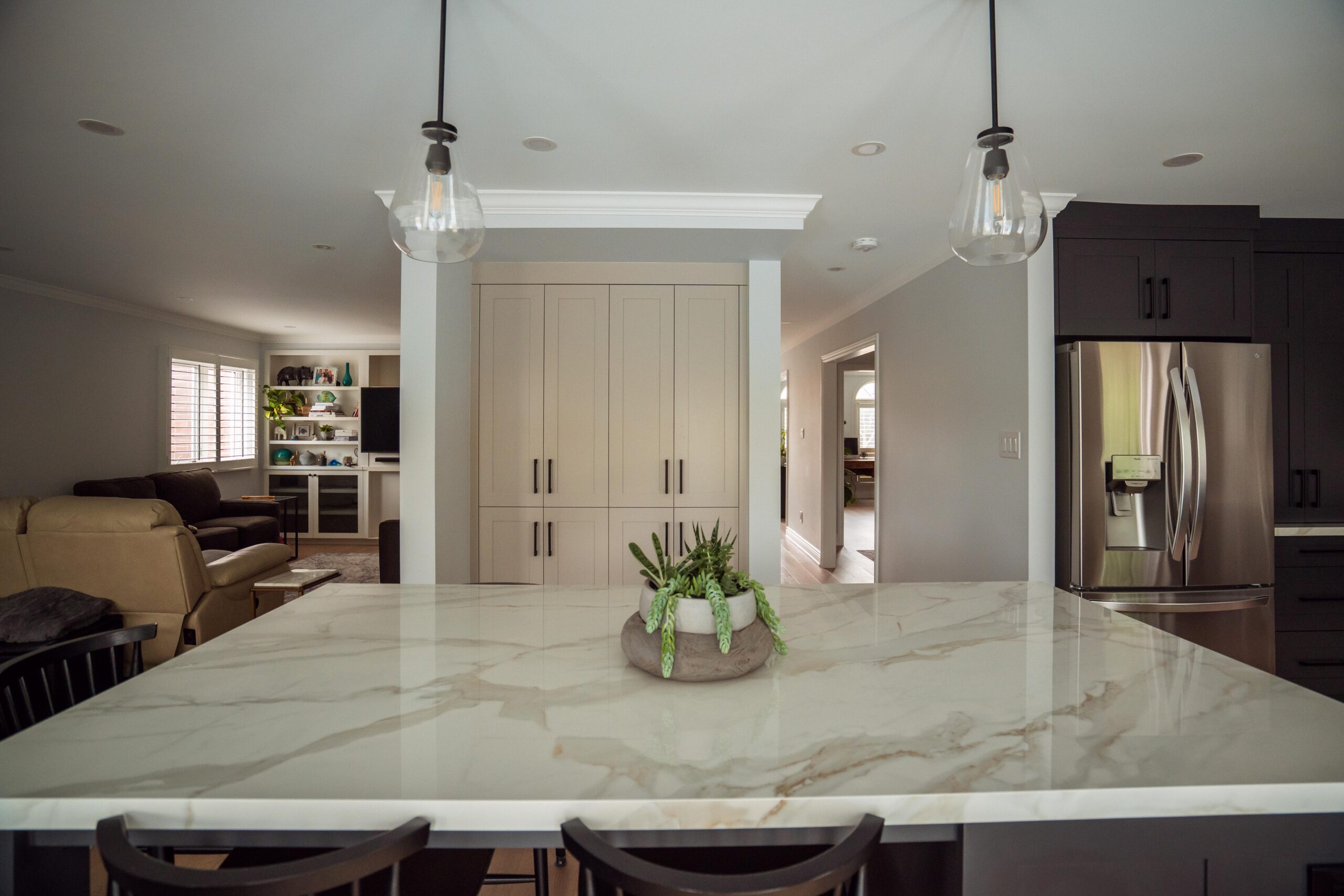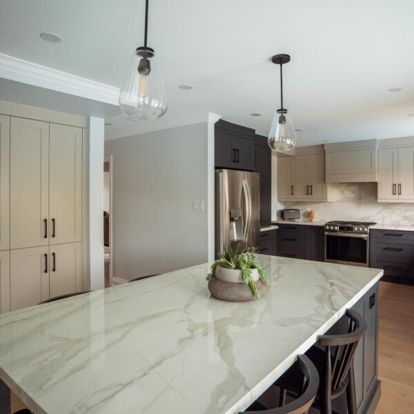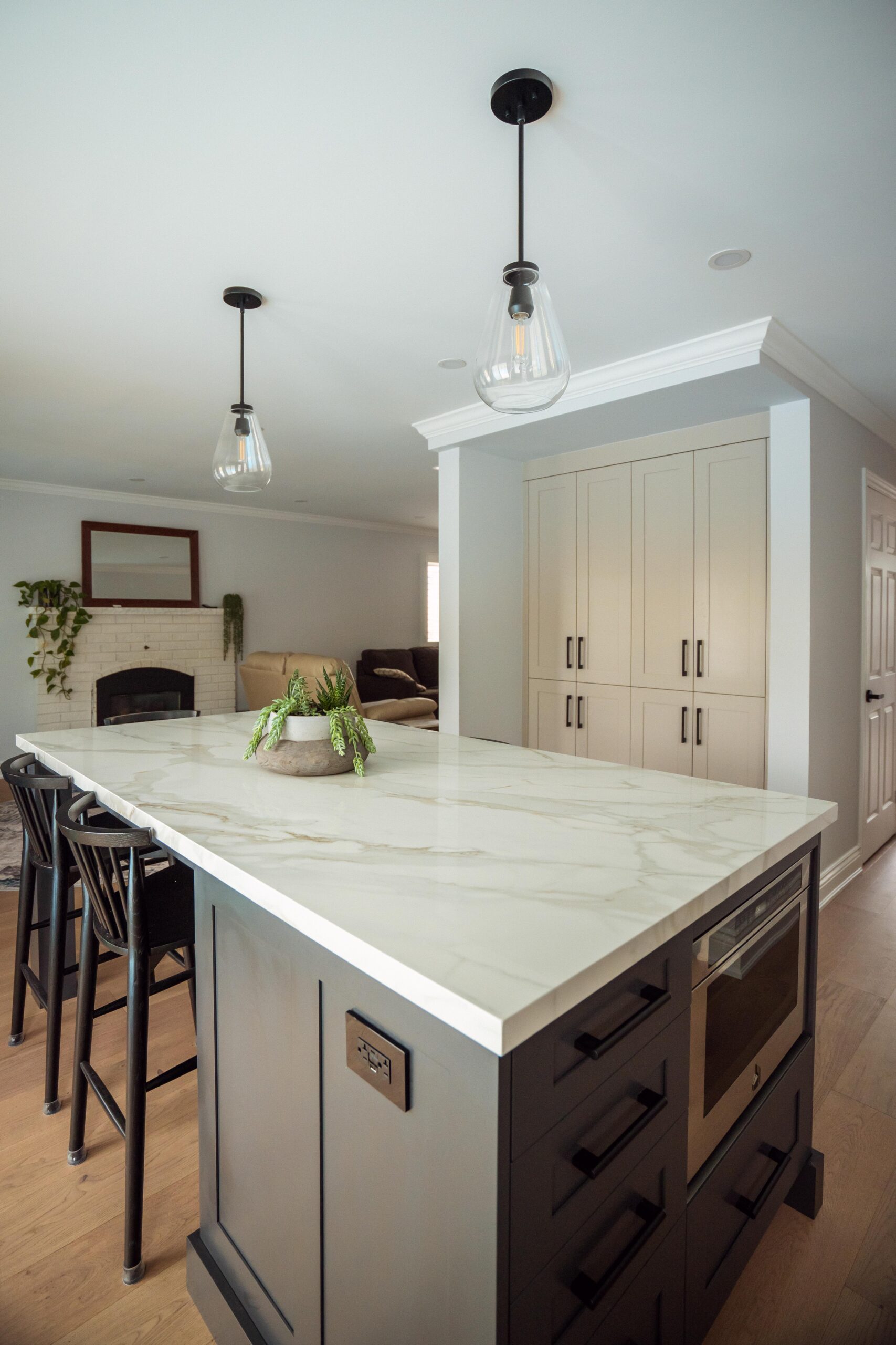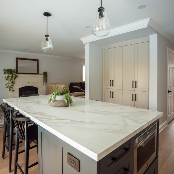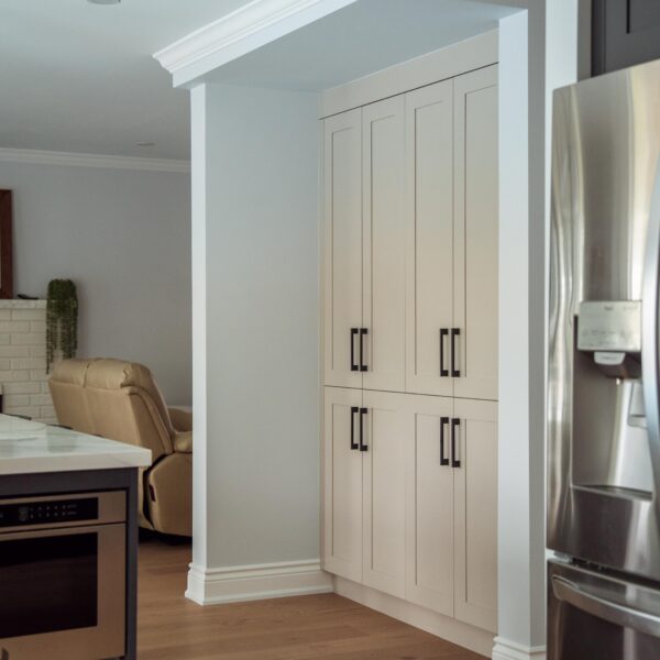 The kitchen received a complete overhaul, removing the old cabinetry and replacing it with custom cabinets, backsplash and stone countertops. We built a beautiful new island for them and a gigantic pantry off to the side where the hallway used to be.