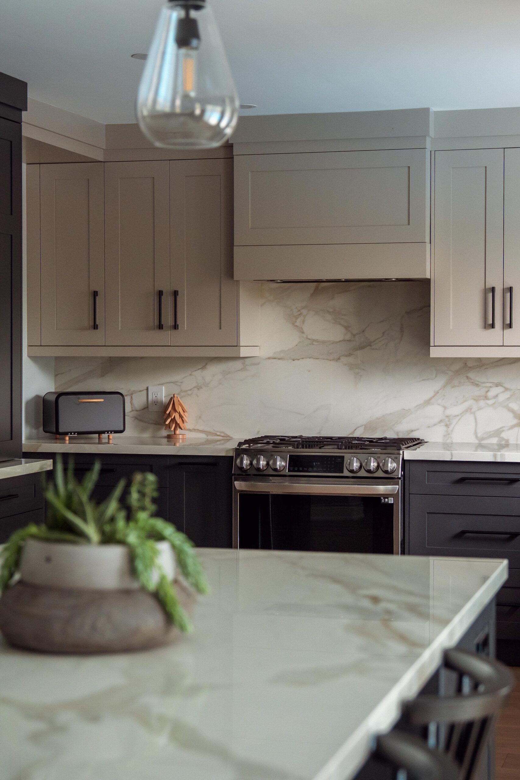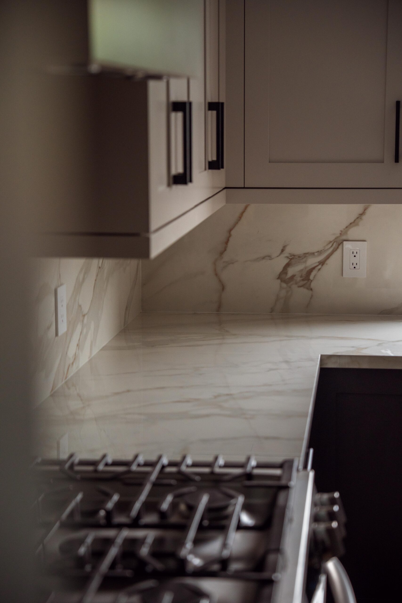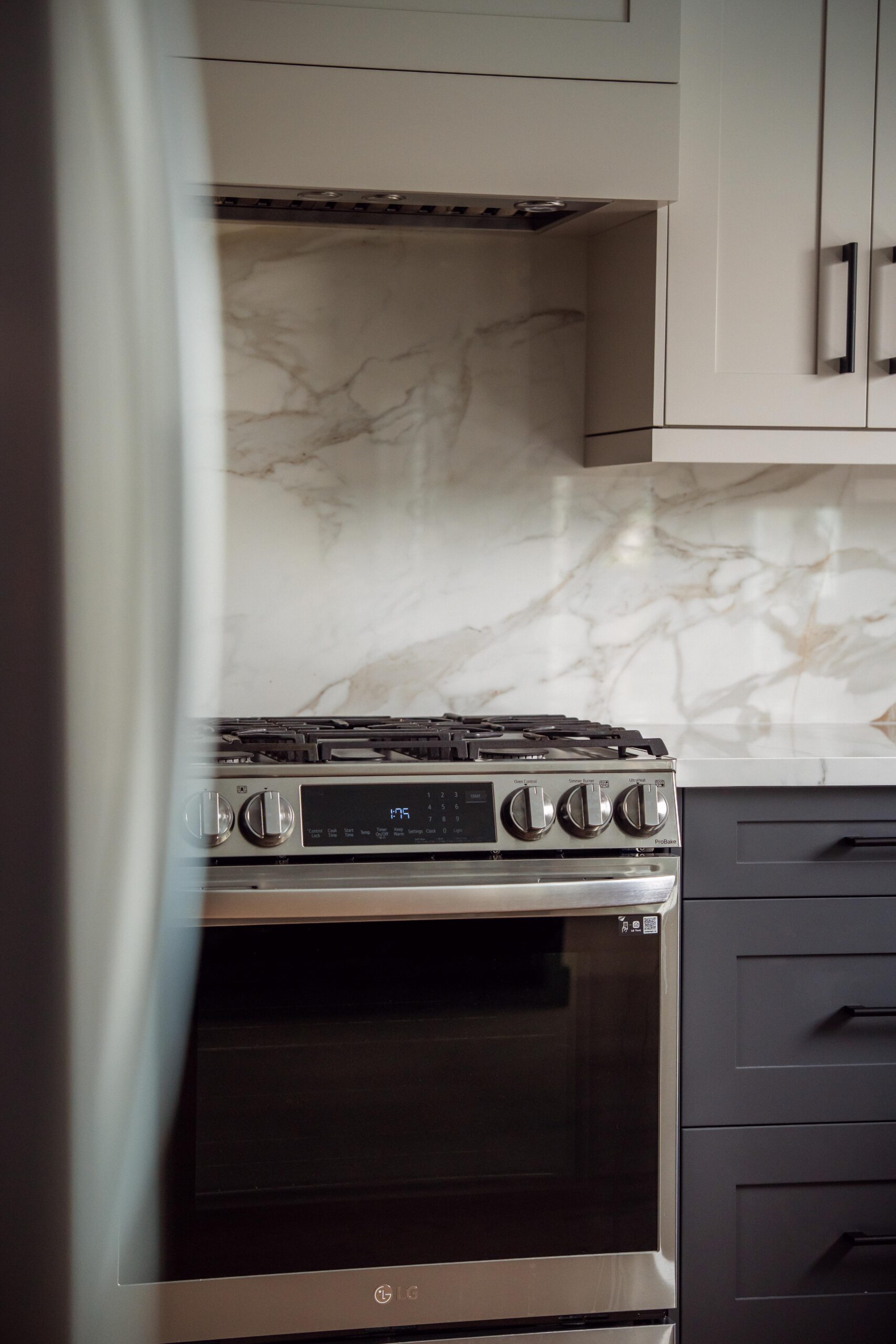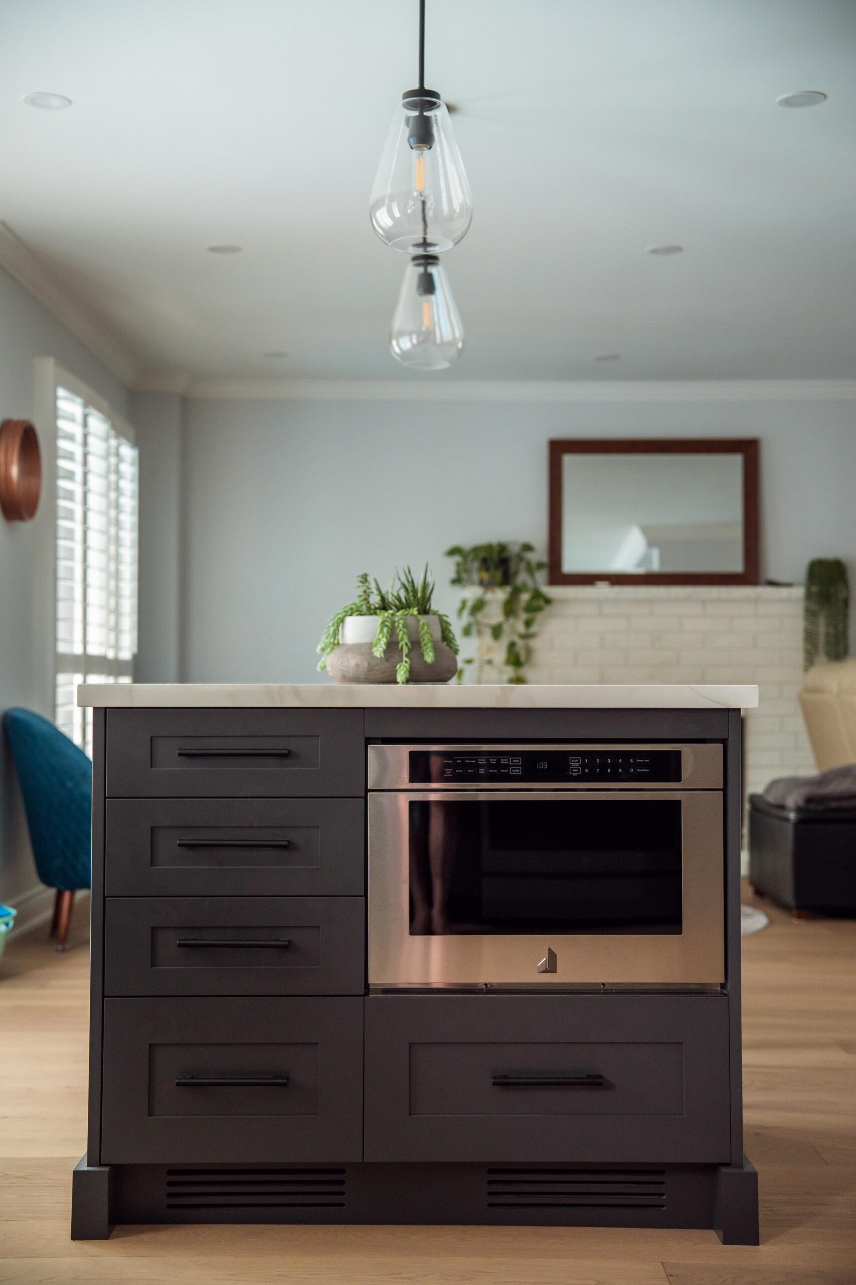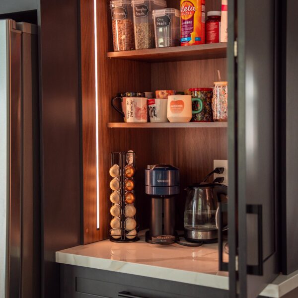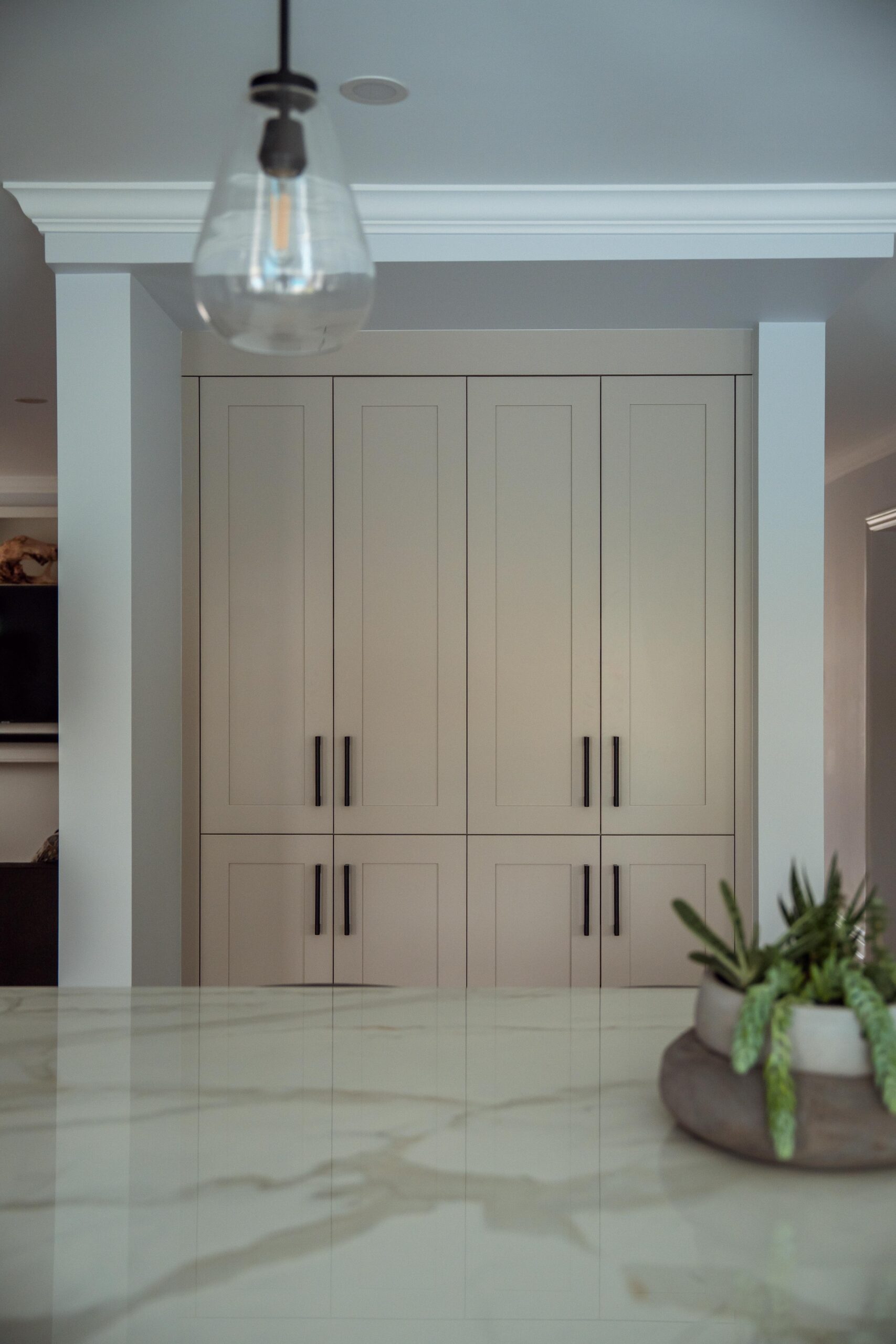 The kitchen received a complete overhaul, removing the old cabinetry and replacing it with custom cabinets, backsplash and stone countertops. We built a beautiful new island for them and a gigantic pantry off to the side where the hallway used to be.