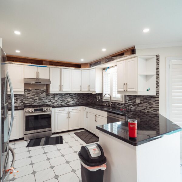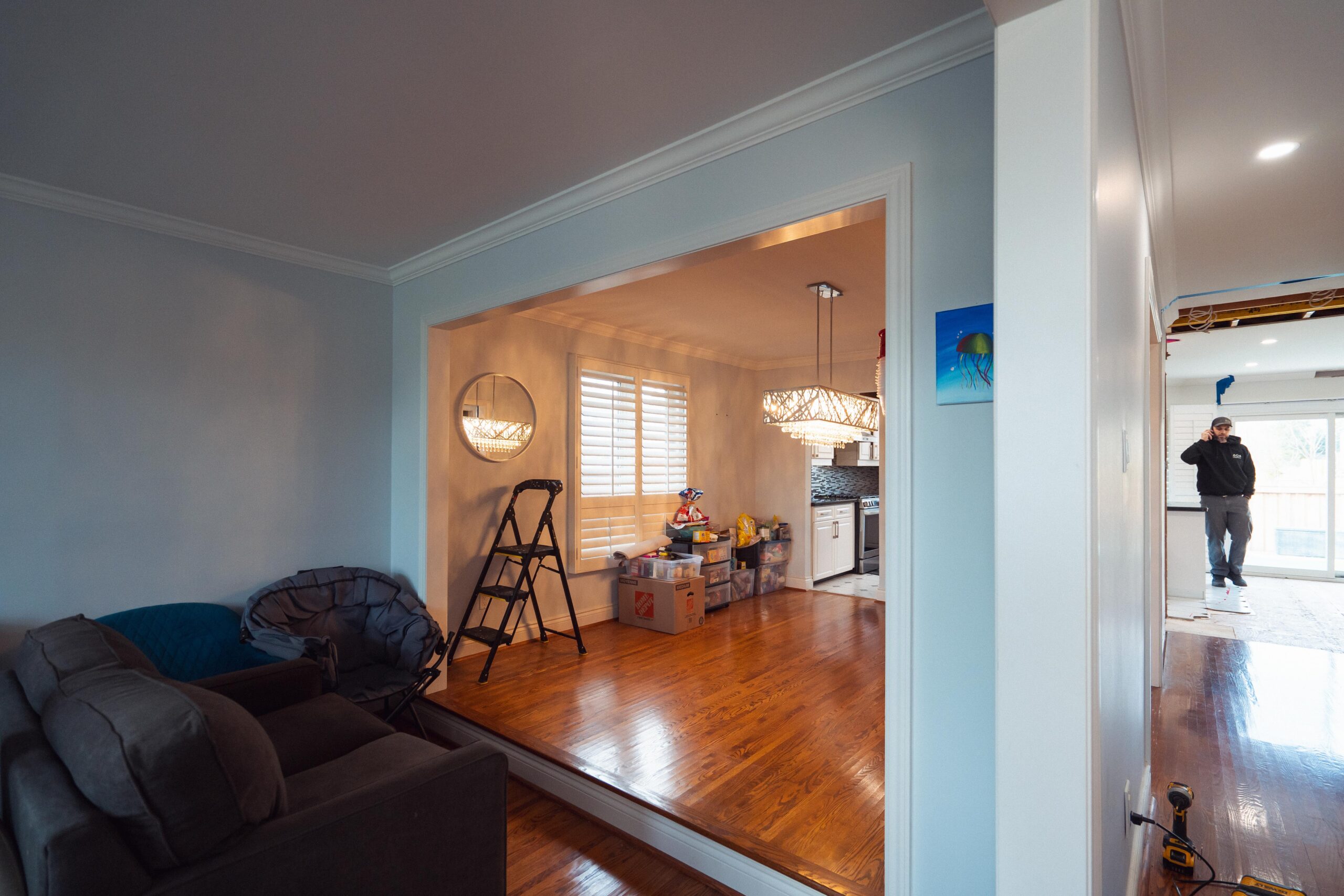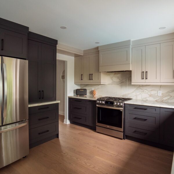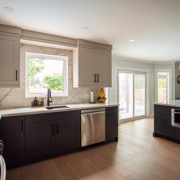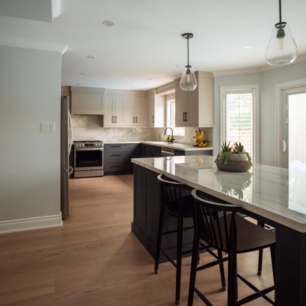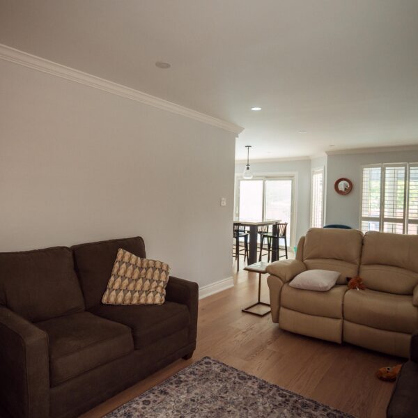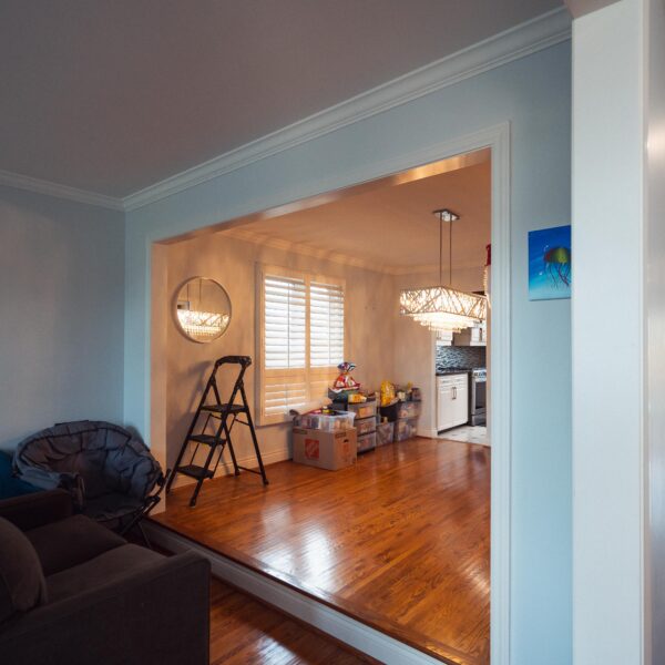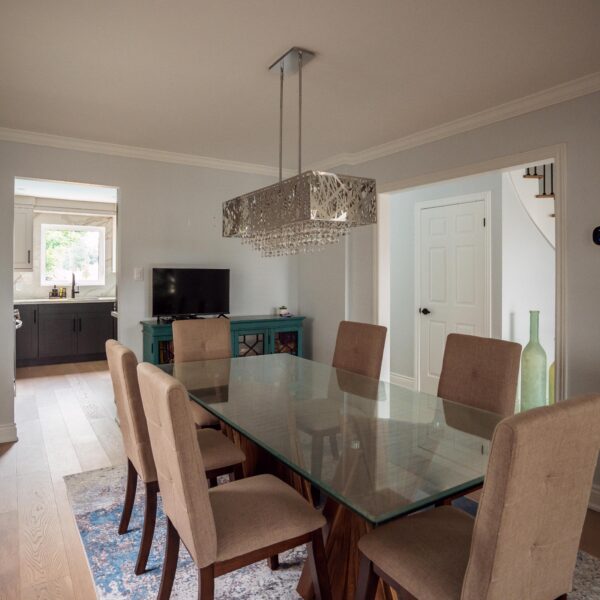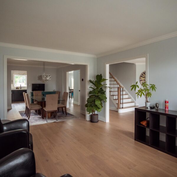 Welcome back to Winding Way! These Burlington homeowners already had us complete 3 bathrooms as well as the foyer of their home, and they were ready for a second phase of the project – tackling the main floor. We were able to remove a load bearing wall between the kitchen and living room, opening up the space and creating the perfect flow to install our new hardwood floors throughout.